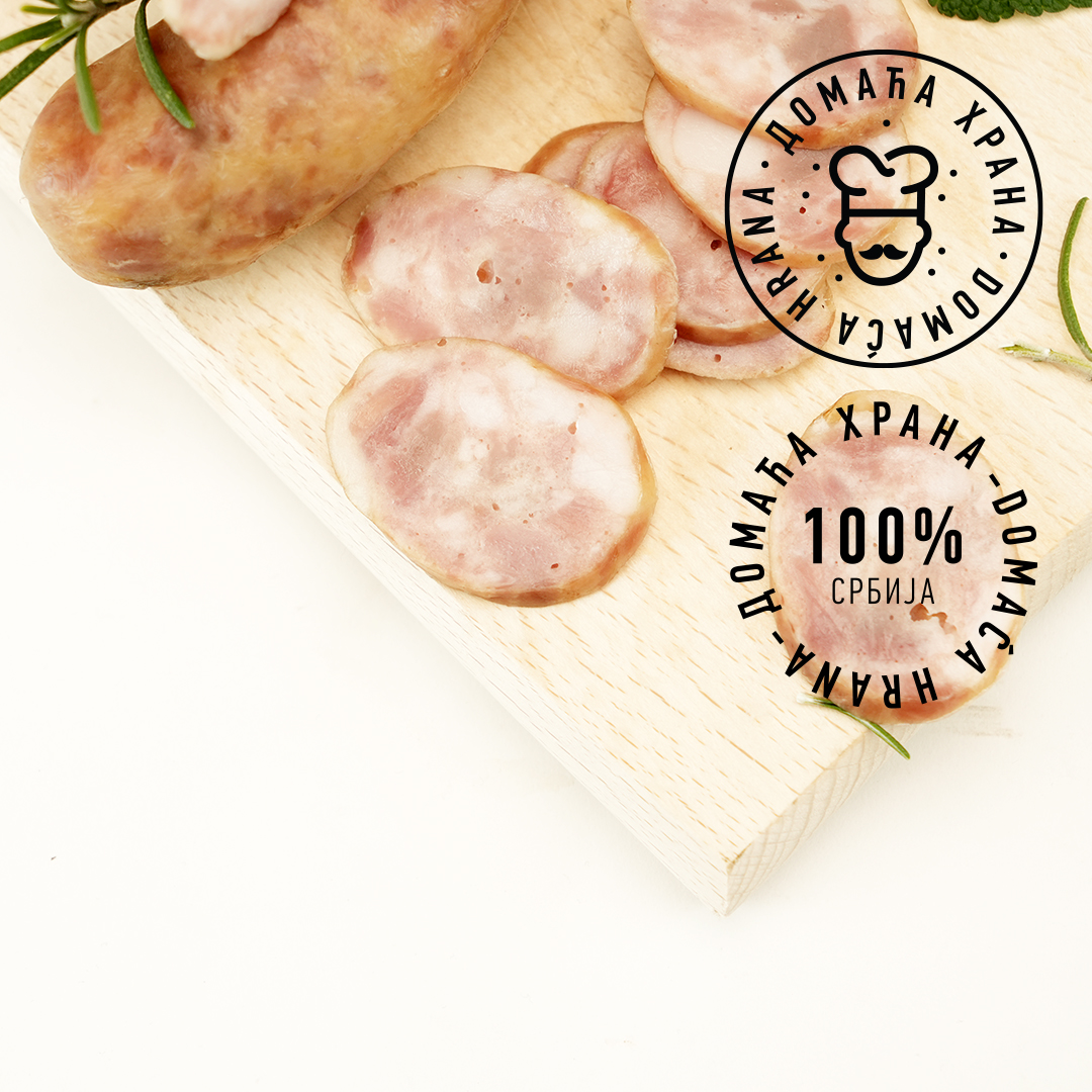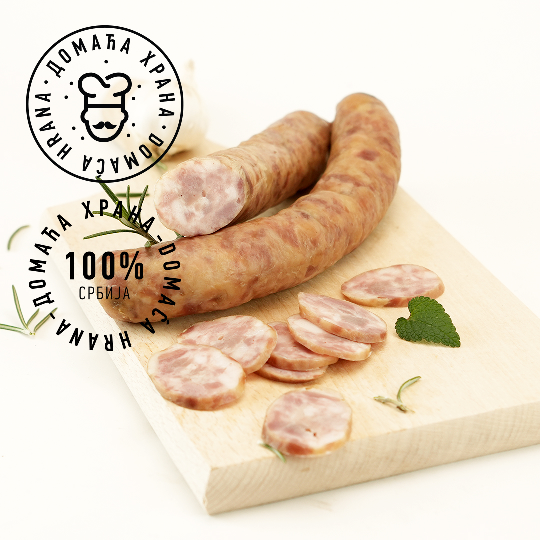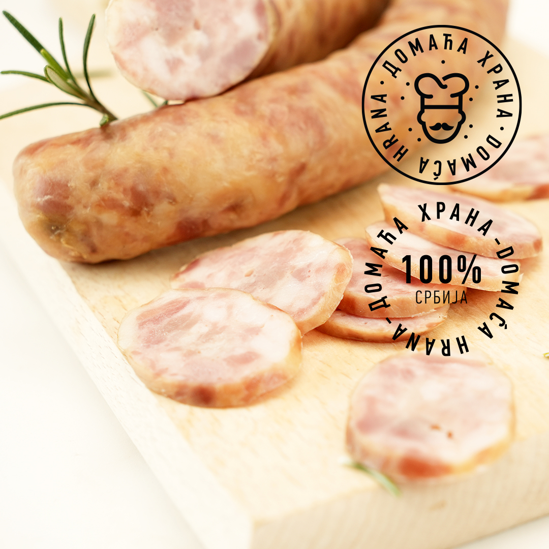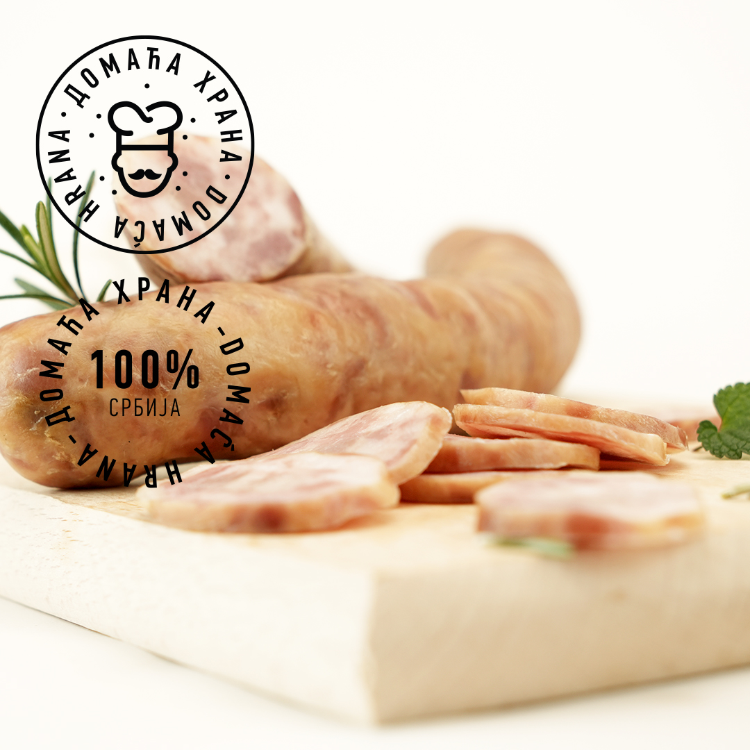 Месо од свиња из слободног узгоја. Шумадијски домаћи производ 100%. Састав производа: Свињско месо, свињска сланина, со, бибер бели лук, ким, пимент