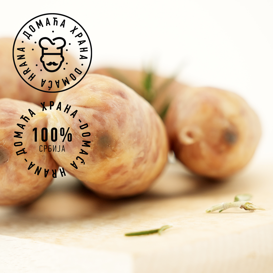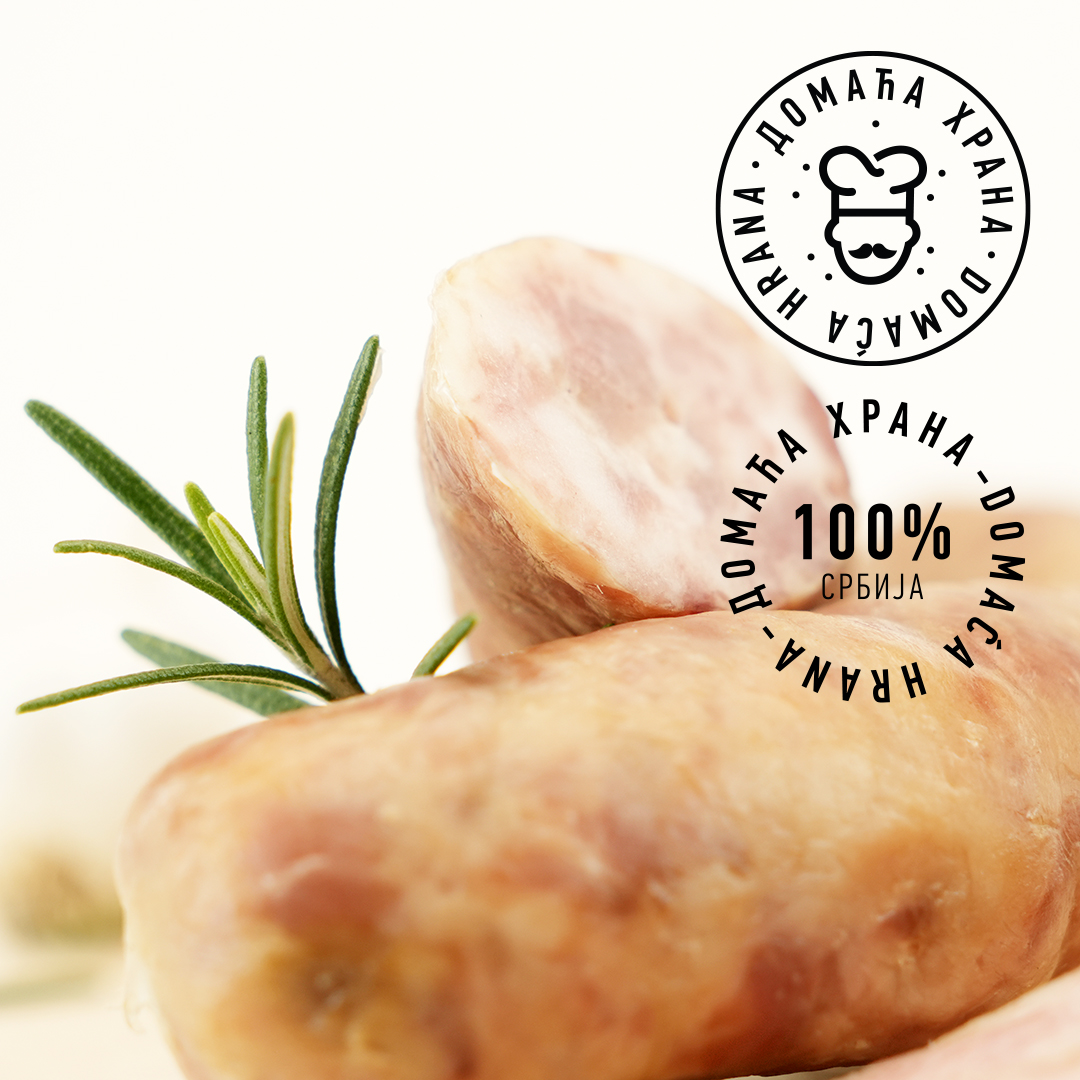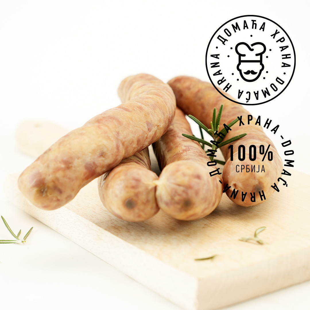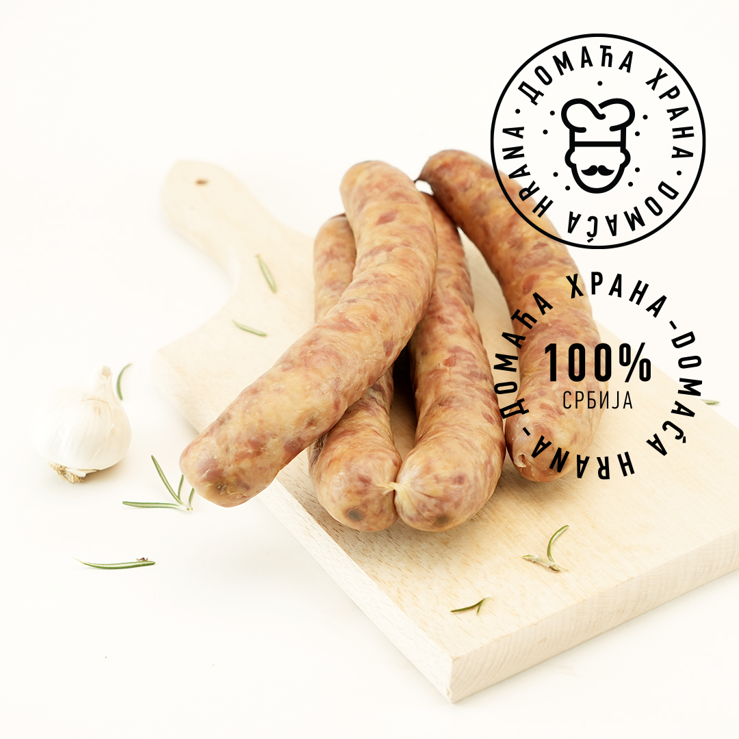 Месо од свиња из слободног узгоја. Шумадијски домаћи производ 100%. Састав производа: Свињско месо, свињска сланина, со, бибер бели лук, ким, пимент