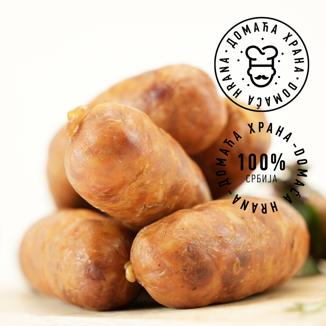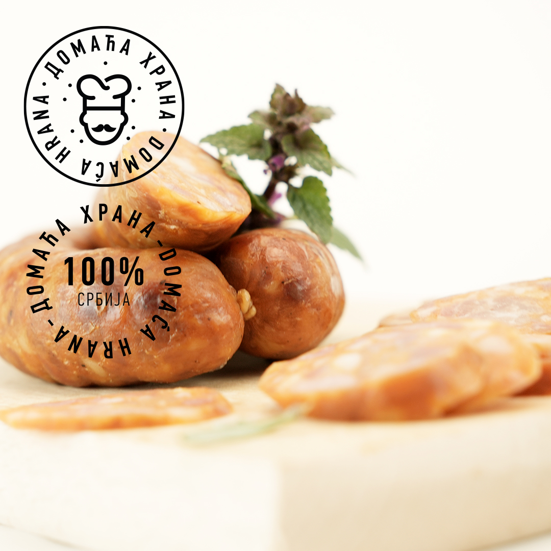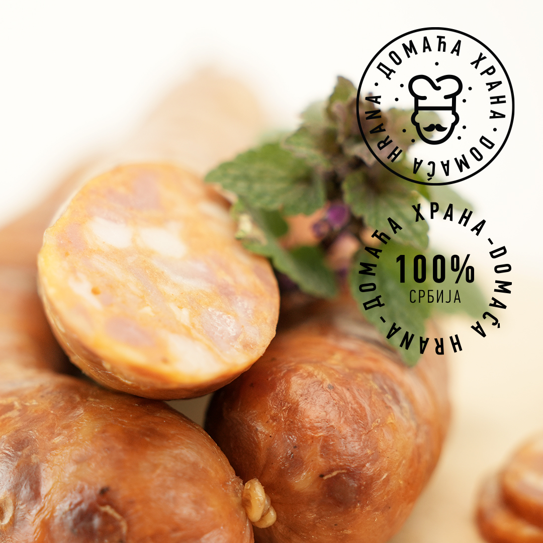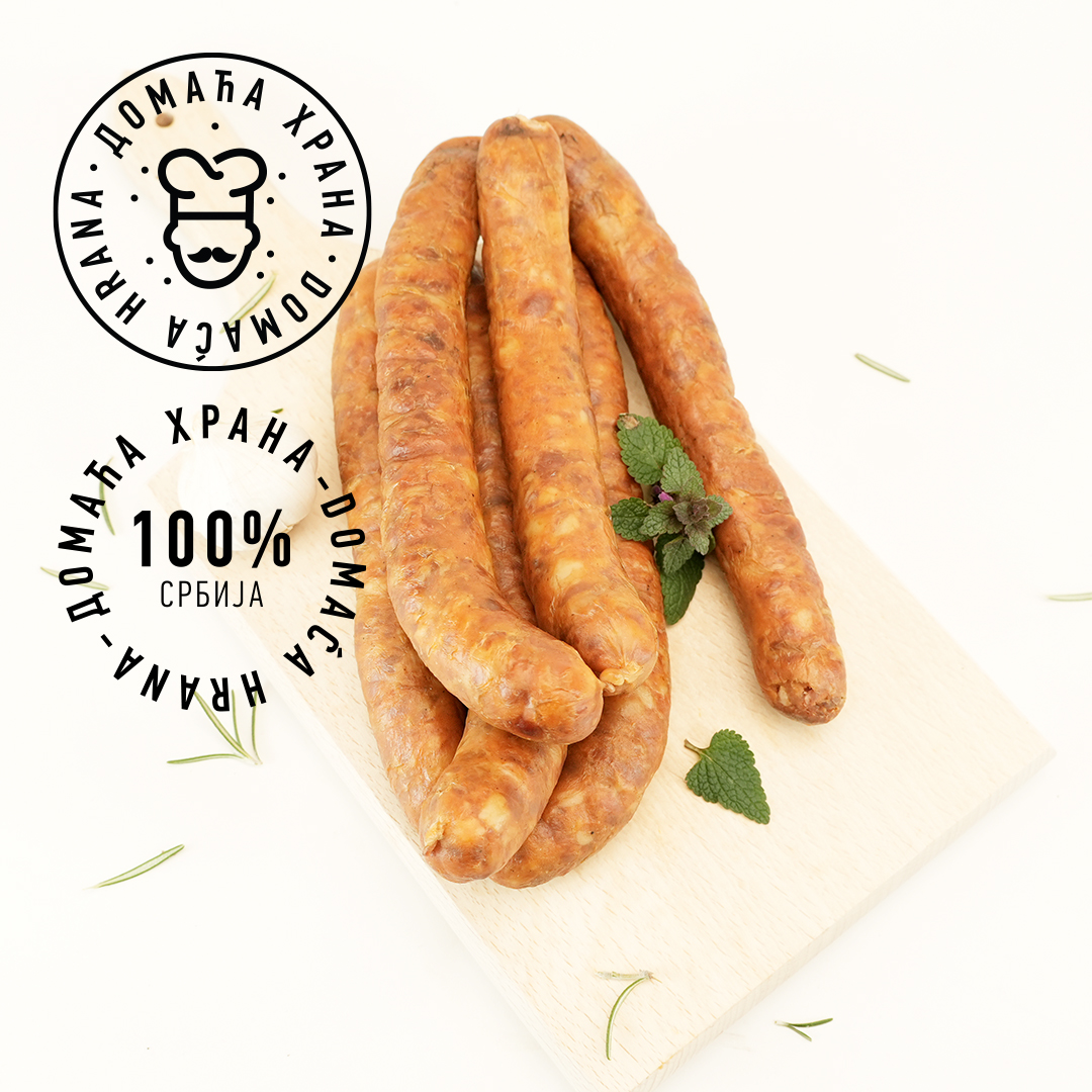 Месо од свиња из слободног узгоја. Шумадијски домаћи производ 100%. Састав: Свињско месо, свињска сланина, со, бибер, бели лук, ким.