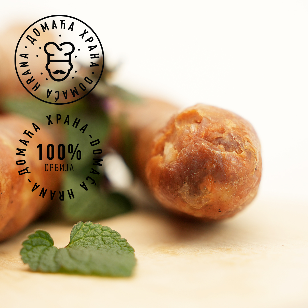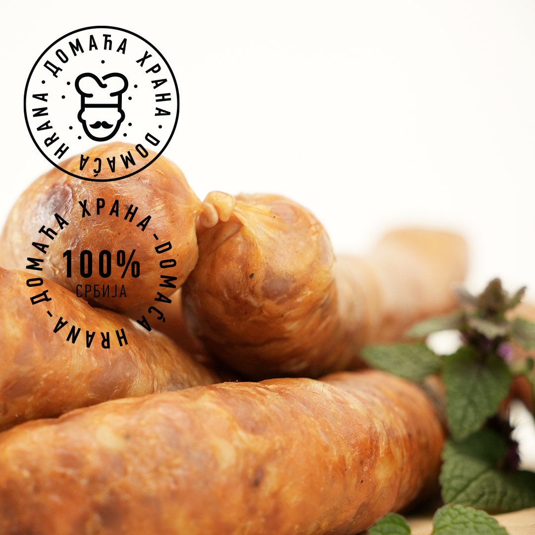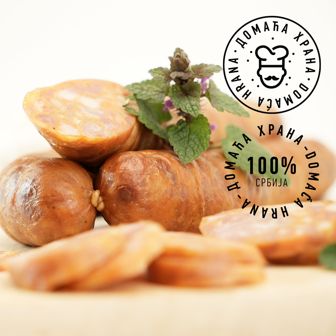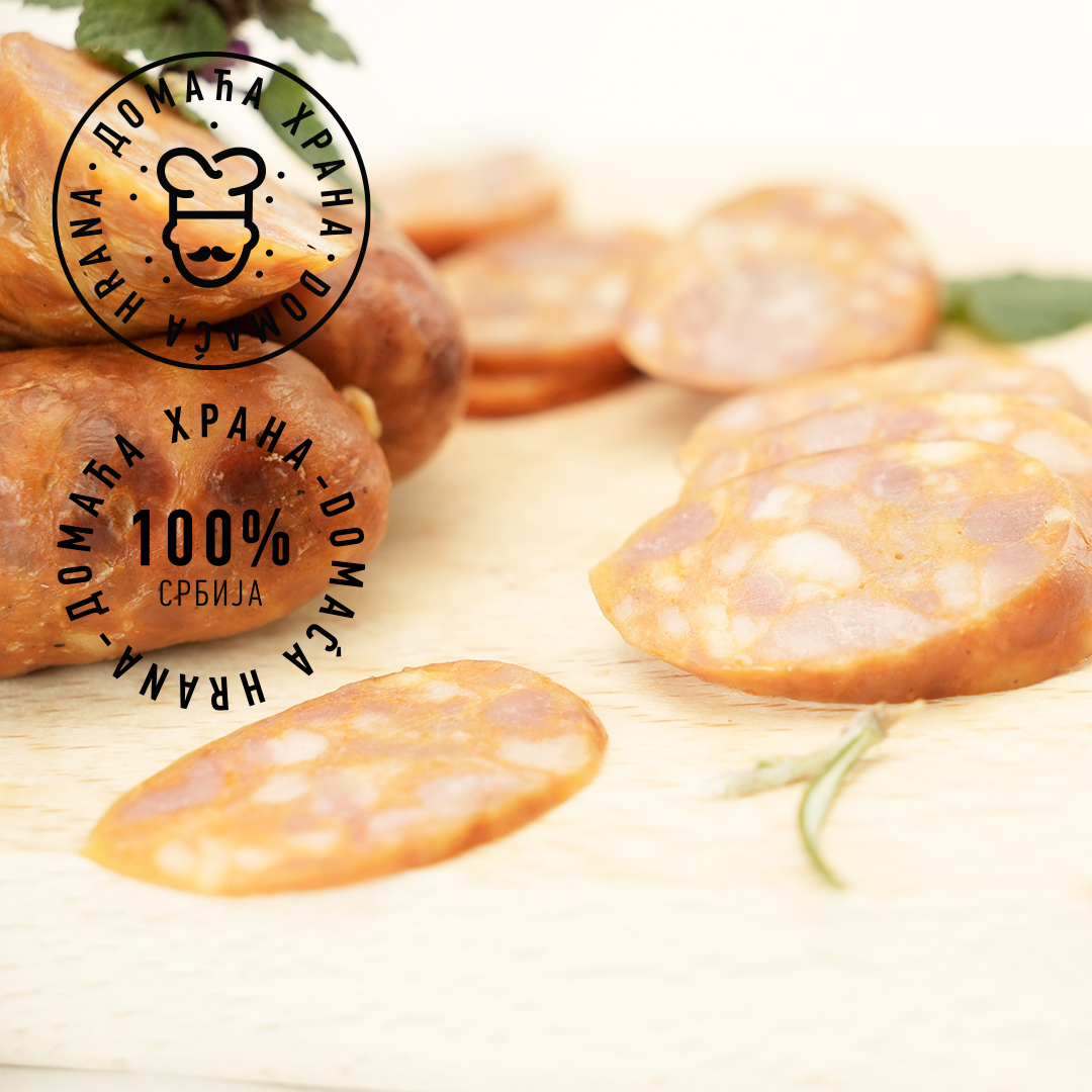 Месо од свиња из слободног узгоја. Шумадијски домаћи производ 100%. Састав: Свињско месо, свињска сланина, со, бибер, бели лук, ким.