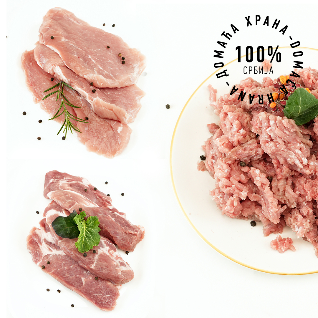 Свеже домаће свињско месо узгајано подно падина планине Рудник. Пакет свињског меса садржи *cca 3кг меса и то: 1кг бута исеченог у шницле, 1кг млевеног меса од бута, 1кг свињског врата. --------------- *cca - скраћеница од латинске речи "circa" (цирка) a у прводу значи приближно или око.