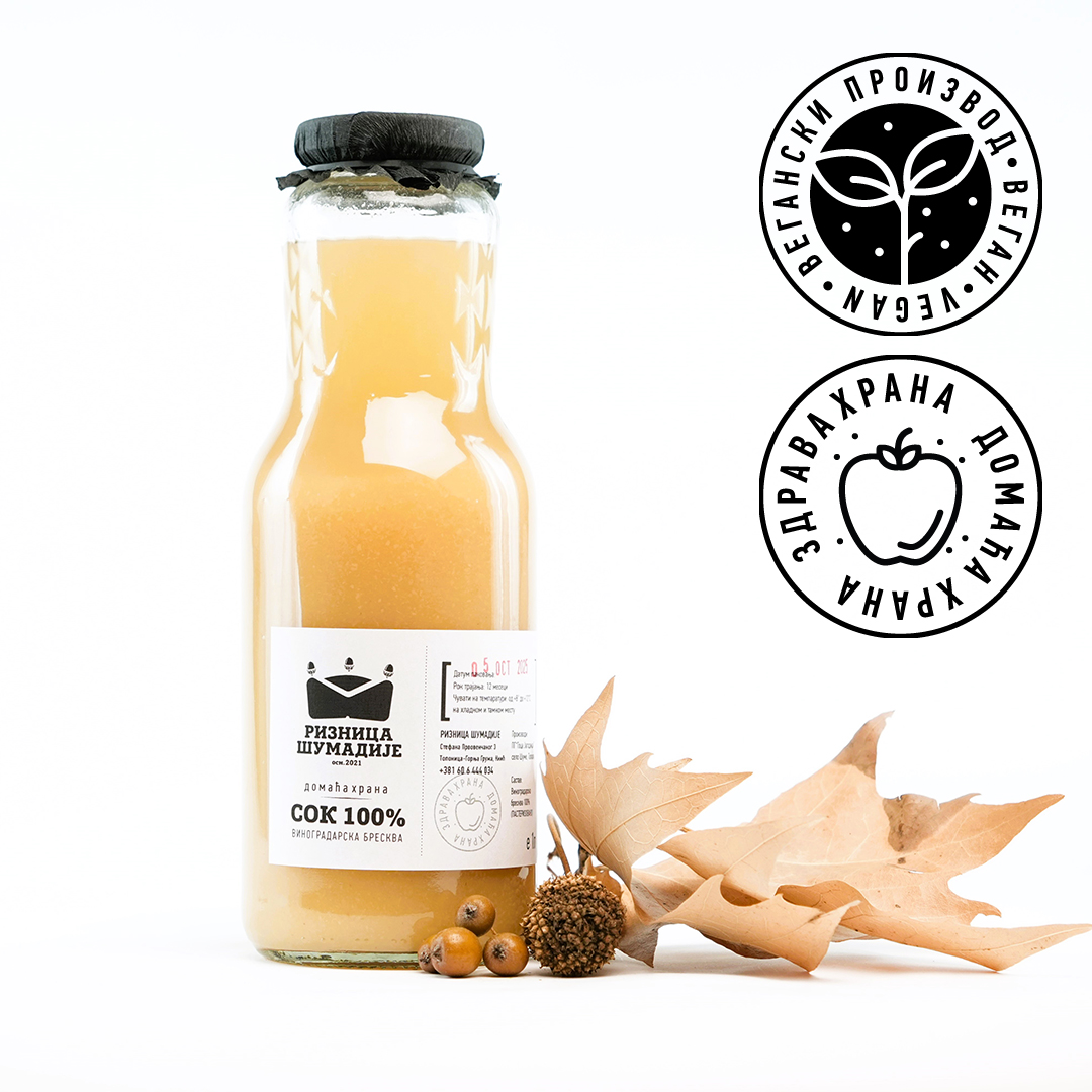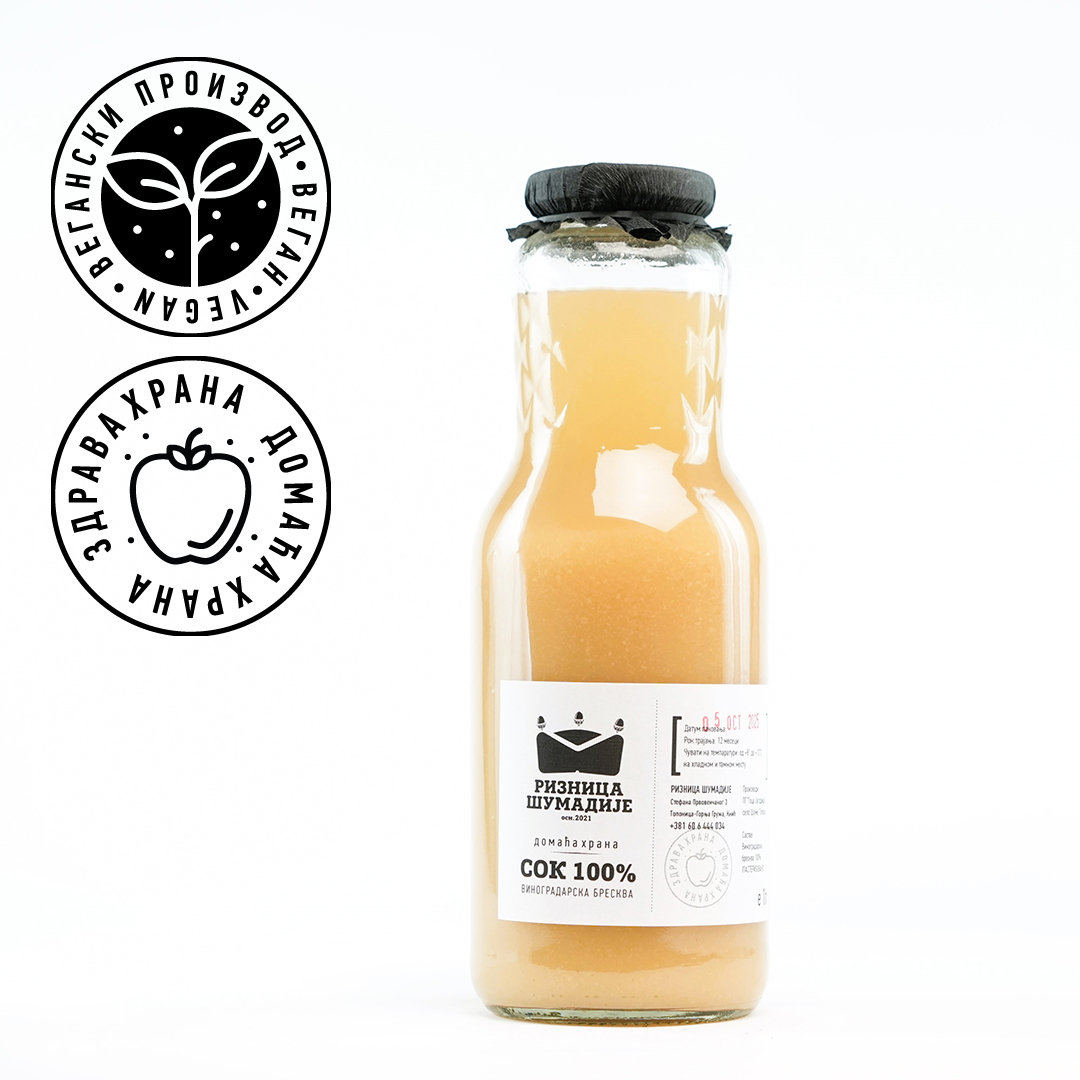 Домаћи цеђени сок од виноградарске брескве, 100% воће без вештачких додатака и без додатог шећера. Виноградарска бресква је старинска сорта која поново добија на значају, посебно у време климатских екстрема. Одликује се изузетно старим пореклом и високом нутритивном вредношћу у поређењу са другим сортама брескви. Ова воћка је не само укусна и слатка, већ и веома здрава, богата бета каротином, беланчевинама, биљним влакнима, биљним мастима и биљним хормонима.