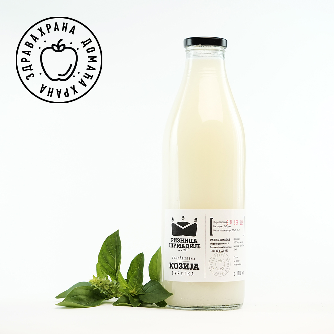 Сурутка од козијег млека. Напомена: Након отварања употребљиво 48 сати. Чувати на темпаратури од +4°C do +8°C /у фрижидеру/. Таложење је природан процес. Производ може да садржи извесне примесе лактозе.