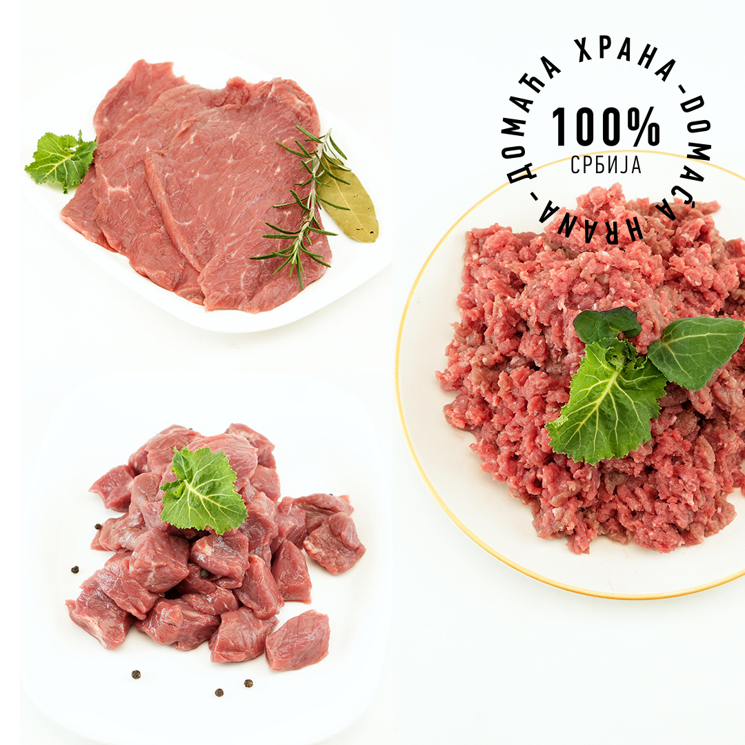 Свеже домаће јунеће месо од говеда из слободног узгоја подно падина планине Рудник. Пакет јунетине садржи *cca 3кг меса и то: 1кг бута исеченог у коцке за гулаш и чорбу, 1кг млевеног меса од бута, 1кг бута исеченог у шницле. --------------- *cca - скраћеница од латинске речи "circa" (цирка) a у прводу значи приближно или око.