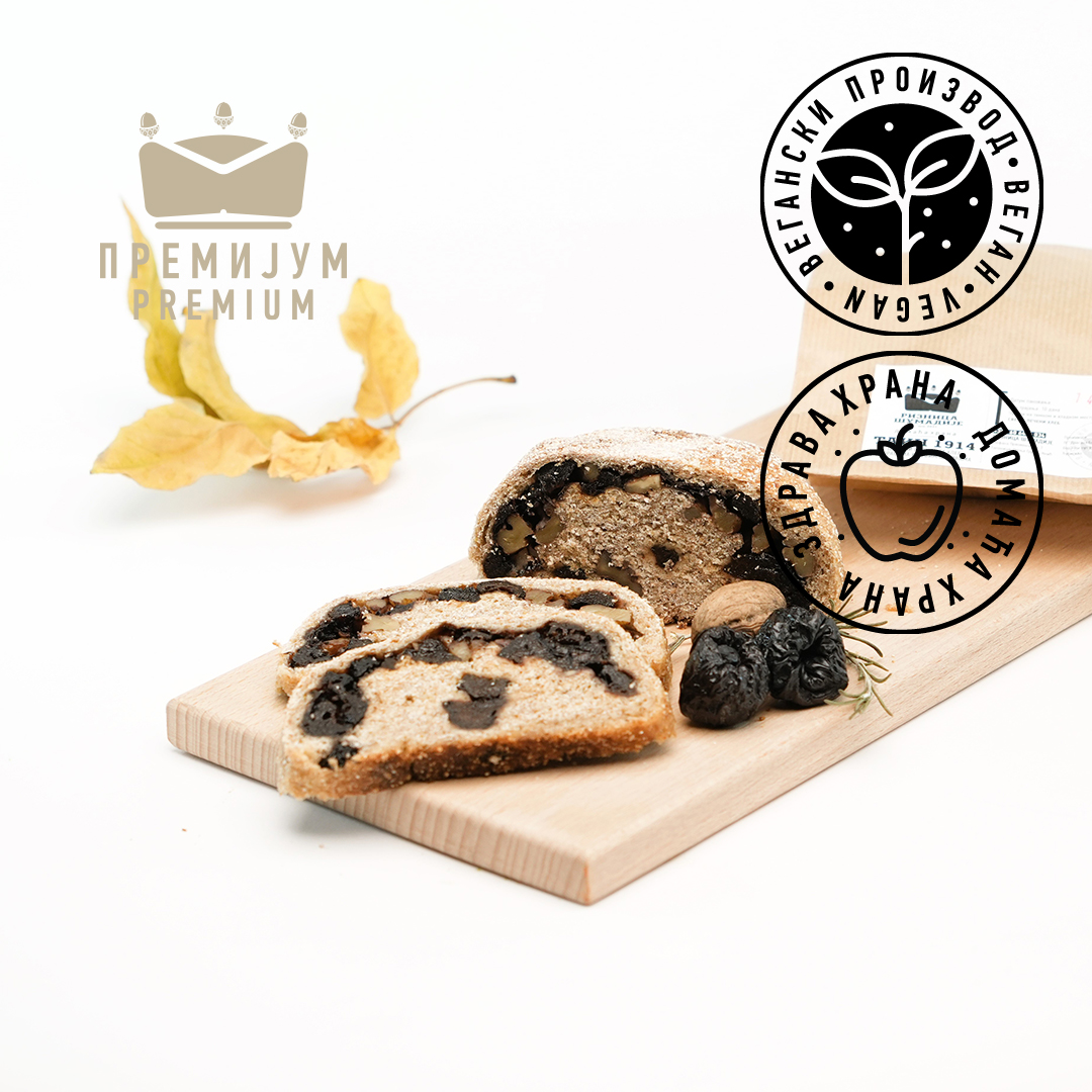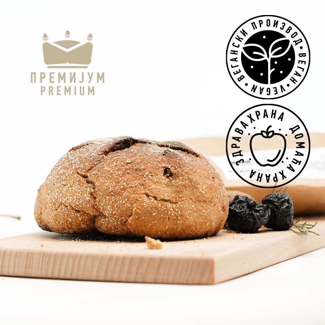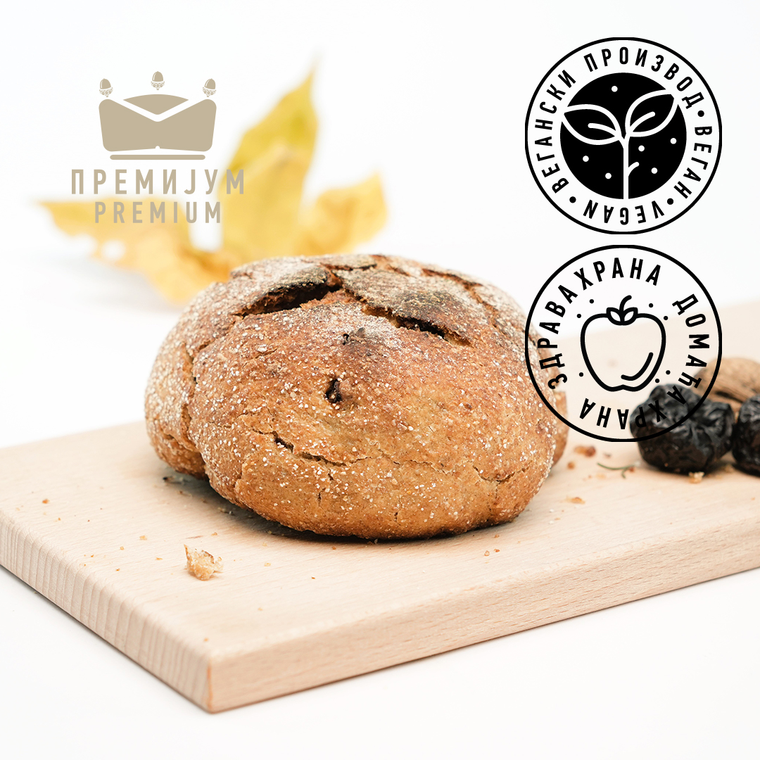 Ражано брашно 70%, спелтино брашно 30%, природни дивљи квасац морска со, мед, суве шљиве, анис, ораси, вода. Може да садржи глутен у траговима од других житарица. Чувати на чистом и сувом месту на темпаратури од +8° do +12°C.